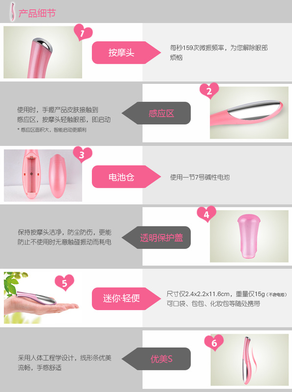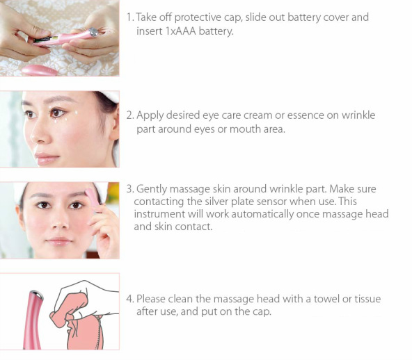 158 Micro Vibrating per second to allow fast penetration and instant result. It rehydrates deep into the skin to relieve puffiness, promotes blood circulation, removes dark circles and wrinkles. Has a remarkable effect on wrinkles when used with anti-wrinkle eye care ampoules/serum. Micro-vibration: Introduces nutrition into basal skin during application which increases micro-circulation and helps reduce eye fatigue. Ionic function: Introduces essence into the deep skin, helps to tighten skin around eyes, and reduces wrinkles and dark circles. Diminishes fine lines and crow’s feet and activates blood flow around the areas of the eye.